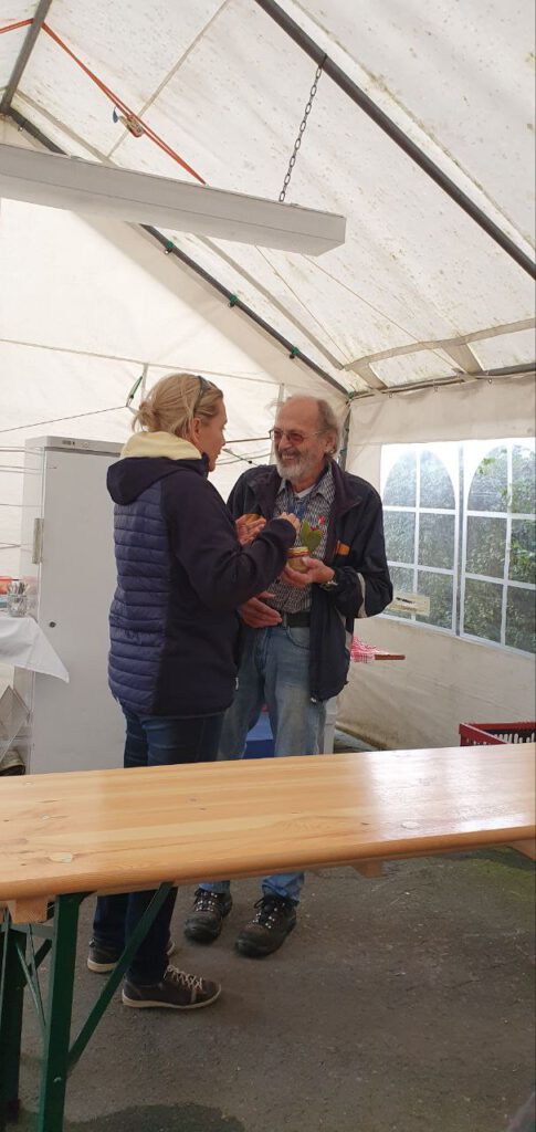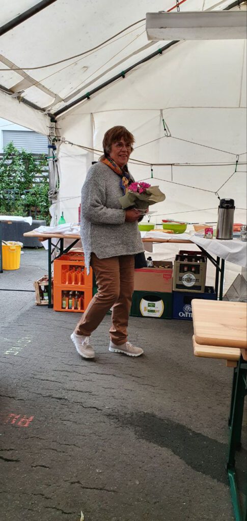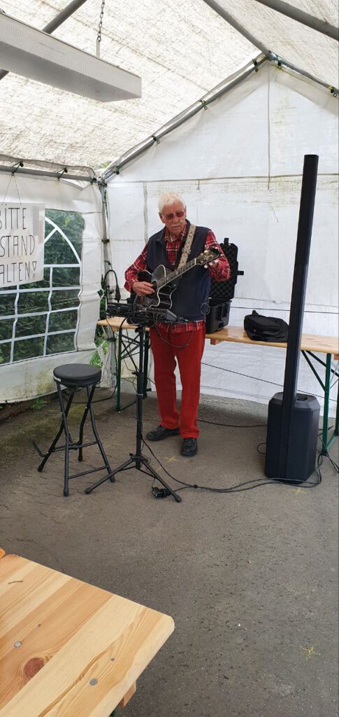Vorbereitet hatte die Veranstalter sehr leckere Kuchen, Kaffee, Salate und Gegrilltes, inklusive einer breiten Getränkeauswahl. Musikalisch – inklusive des Geburtstagsständchens, das alle mitsangen – wurde die Feier, wie bei manch anderen Veranstaltungen auf dem Wochenmarkt, von Herrn Heinz Sawellion aus Krofdorf mit Gitarre und Gesang begleitet. An Spenden für Mayschoß im Ahrtal kamen an diesem Tag 142,50 € zusammen.