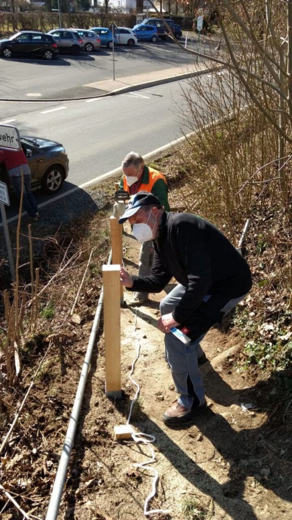 Wie angekündigt, baute die „abgespeckte Truppe“ der Bürgerkommune Fellingshausen, wie Dieter Synowzik es nannte, ein ähnliches Geländer, wie schon zuvor auf dem Friedhof (siehe unseren Bericht vom März 2021), nun am Hang von der Gladenbacher Straße zum Burgweg.