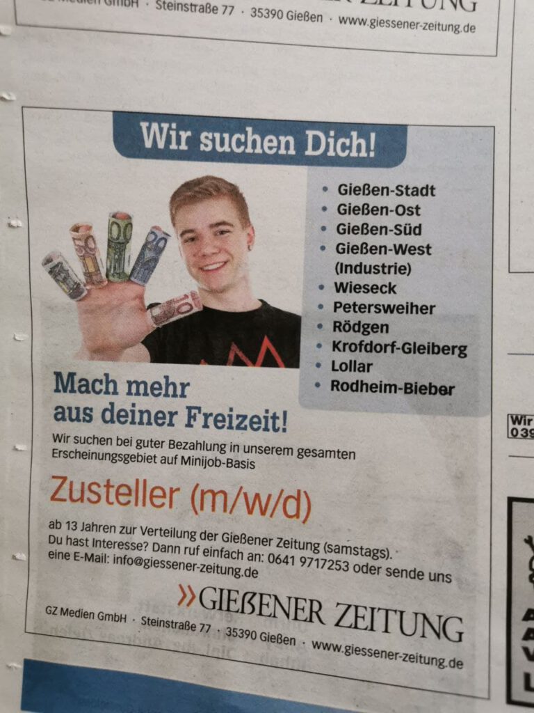 Mit diesen 2 Anzeigen wirbt die Gießener Zeitung allwöchentlich für neue Austräger. Aber es ist wirklich so lukrativ, wie es in den Anzeigen versprochen wird? Zur Erklärung: Die Giessener Zeitung ist kostenlos und wird in der Regel samstags an alle Haushalte verteilt, vorausgesetzt kostenlose Zeitungen sind erlaubt. Die Zeitung besteht hauptsächlich aus Berichten von Bürgern aus dem Kreis Gießen und wird auch als Mitmachzeitung betitelt. Zudem enthält sie Werbeprospekte, wie Globus, Rewe, Edeka, Real und einige andere. Lesen Sie weiter unter: