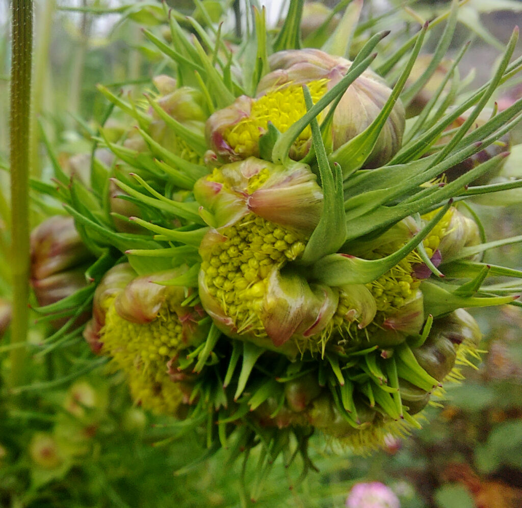 Im Juli fiel mir eine völlig untypische Studentenblume (=Tagetes) auf. Sie sah aus wie ein Hexenbesen und zeigte, während überall Knospen und die ersten Blüten gebildet wurden, nicht die leisesten Anzeichen dafür. Sie war also eindeutig steril – bis heute. Erst als ich im September auch an einer Cosmea ungewöhnliche Veränderungen beobachtete – siehe Foto oben – ging ich dieser Sache weiter nach.