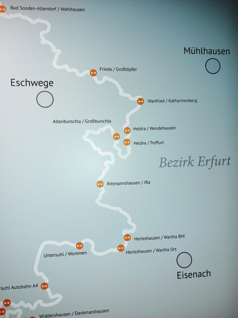Rechts sieht man als weiße Linie den Grenzverlauf zwischen Nordhessen und Thüringen. Teilweise folgte die Grenze der Werra, die bei Altenburschla zwei Schleifen bildete. was in den ersten Jahren nach 1961 noch Rufkontakt ermöglichte. Meine Tour führte über Eschwege-Wanfried-Mühlhausen.